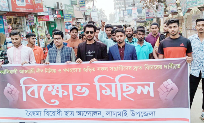 গত বৃহস্পতিবার (৬ই ফেব্রæয়ারি) বিকেলে কুমিল্লা-নোয়াখালী আঞ্চলিক মহাসড়কের লালমাই উপজেলার বাগমারা বাজারে বিক্ষোভ মিছিলটি অনুষ্ঠিত হয়। বাগমারা উচ্চ বিদ্যালয়ের সামনে থেকে মিছিলটি শুরু হয়ে নিউ মার্কেটে গিয়ে শেষ হয়। মিছিলে শিক্ষার্থীরা আওয়ামী লীগ, যুবলীগ, স্বেচ্ছাসেবকলীগ, কৃষকলীগকে নিষিদ্ধ, সাবেক প্রধানমন্ত্রী শেখ হাসিনা, সাবেক অর্থমন্ত্রী আহম মুস্তফা কামালের বিচারের দাবিসহ ফ্যাসিবাদ বিরোধী বিভিন্ন ¯েøাগান দেয়।