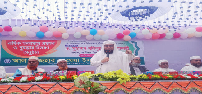 নিজস্ব প্রতিনিধি॥ গত ২৬শে ডিসেম্বর আধুনিক শিক্ষার সমন্বয়ে প্রতিষ্ঠিত আন্তর্জাতিক মানের প্রতিষ্ঠান আল আজহার জামেয়া ইসলামিয়া বাংলাদেশ এর উদ্যোগে কুমিল্লার পদুয়ার বাজার বিশ্বরোডস্থ নিজস্ব ক্যাম্পাসে বার্ষিক ফলাফল প্রকাশ ও পুরস্কার বিতরণ অনুষ্ঠিত হয়। এতে মাদরাসার অধ্যক্ষ মাও. মুহাম্মদ ইউনুছ এর সভাপতিত্বে এবং সহকারী শিক্ষক মাও. জহিরুল ইসলাম এর পরিচালনায় প্রধান অতিথির বক্তব্য রাখেন, ড. মাও. খলিলুর রহমান আল মাদানী, অধ্যক্ষ, তা’মীরুল মিল্লাত কামিল মাদরাসা, যাত্রাবাড়ী শাখা, ঢাকা। বিশেষ অতিথির বক্তব্য রাখেন, আল আজহার মাদরাসার একাডেমিক কমিটির চেয়ারম্যান এবং ট্রাস্টের ভাইস চেয়ারম্যান এটিএম সিরাজুল হক, ট্রাস্টের ভাইস-চেয়ারম্যান ডা. মোঃ সফিকুর রহমান পাটোয়ারী, অধ্যক্ষ, সেন্ট্রাল মেডিকেল কলেজ, কুমিল্লা, ট্রাস্ট্রের ভাইস-চেয়ারম্যান অধ্যাপক আলী আশ্রাফ খান, ট্রাস্টের সহ-সেক্রেটারী মুহা. মিজানুর রহমান, ট্রাস্টের সদস্য মাস্টার নুরুল হক, মুহা. ফজলুল হক, শেখ আহম্মদ ও ছাত্র অভিভাবক ইকবাল হোসেন প্রমুখ। অনুষ্ঠানে বিভিন্ন ক্লাসে ১ম, ২য় ও ৩য় স্থান অধিকারকারী প্রায় ৮০ জন ছাত্র-ছাত্রীকে পুরস্কার প্রদান করা হয় এবং বাংলাদেশ মাদরাসা শিক্ষা উন্নয়ন এসোসিয়েশন (মেধা)’ বৃত্তি পরীক্ষায় উত্তীর্ণ ২৭ জন শিক্ষার্থীকে ট্যালেন্টপুল এবং ২৫ জনকে সাধারণ গ্রেডে বৃত্তির সার্টিফিকেট ও নগদ অর্থ প্রদান করা হয়। অনুষ্ঠানে আরো উপস্থিত ছিলেন, শিক্ষার্থীর অভিভাবক, শিক্ষক, এলাকার গণ্যমান্য ব্যক্তিবর্গ ও ছাত্র-ছাত্রী প্রমুখ।