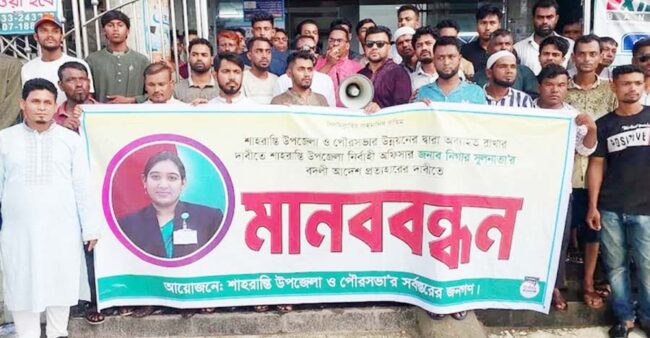 ইউএনও’র বদলি আদেশ প্রত্যাহারের দাবিতে শাহরাস্তিতে মানববন্ধন
