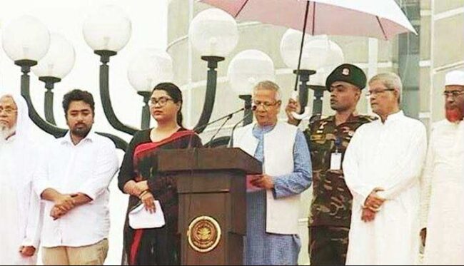 ২০। যেহেতু জনগণের দাবি অনুযায়ী এরপর অবৈধ দ্বাদশ জাতীয় সংসদ ভেঙে দেওয়া হয় এবং সংবিধানের ১০৬ অনুচ্ছেদ অনুসারে সুপ্রিম কোর্টের মতামতের আলোকে সাংবিধানিকভাবে ড. মুহাম্মদ ইউনূসের নেতৃত্বে ৮ই আগস্ট ২০২৪ তারিখে একটি অন্তর্বর্তীকালীন সরকার গঠন করা হয়;