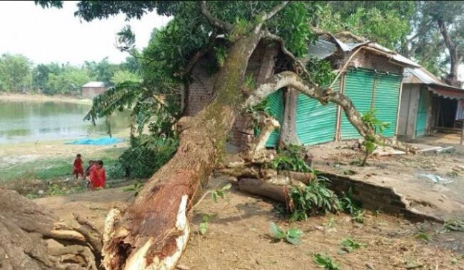 উদ্ধার করে বালিয়াডাঙ্গী উপজেলা স্বাস্থ্য কমপ্লেক্সে নিয়ে গেলে চিকিৎসক তাকে মৃত ঘোষণা করেন।’ এছাড়া, পাড়িয়া ইউনিয়নের গ্রাম পুলিশের দফাদার আজিজুর রহমান বলেন, ‘ঝড়ের সময় বারান্দায় বসে ছিলেন দবিরুল ইসলাম ওরফে বেকার স্ত্রী জাহেদা। মেঘের গর্জন আর ঝড়ে গাছপালা উড়তে দেখে বারান্দাতেই মৃত্যু হয় তার।’ একই উপজেলার শালডাঙ্গা গ্রামের দবিরুল ইসলাম ওরফে বেকা বলেন, ‘আমার স্ত্রী দীর্ঘদিন ধরে অসুস্থ ছিল। ঝড়ের সময় ভয়ে স্ট্রোক করেছে বলে ধারণা করছি।’ লালাপুর নয়াপাড়া গ্রামের নাজমুল ইসলাম বলেন, ‘বাড়ির পাশে গর্তে বৃষ্টির পানি জমে ছিল। খেলতে গিয়ে শিশুটি পড়ে গিয়েছিল। পরে পরিবারের লোকজনের নজরে এলে তাকে উদ্ধার করে।’ ঝড়ে পাড়িয়া ইউনিয়নের তিলকড়া, শালডাঙ্গা, বঙ্গভিটা, লোহাড়া, বামুনিয়াসহ ৬টি গ্রাম, বড়বাড়ী ইউনিয়নের বেলহাড়া, বেলবাড়ী, বটের হাট, হরিপুরসহ ৪টি গ্রাম ক্ষতিগ্রস্ত হয়েছে। বেশির ভাগ কাঁচাবাড়ির টিনের চালা উড়ে গেছে। গাছ ভেঙে পড়েছে ঘরের ওপর। বড়বাড়ী ইউনিয়নের আধারদিঘী বাজারে ৫টি দোকান ও ২টি হোটেলে গাছ ভেঙে পড়েছে। ঘরের টিন নষ্টসহ সার ও কীটনাশক ব্যবসায়ী ও সিমেন্টের ব্যবসায়ীর ৫ লক্ষাধিক টাকা ক্ষতি হয়েছে। আধারদিঘী বাজারের ব্যবসায়ী হাসান আলী বলেন, ‘বাজারে শতবর্ষী কিছু আমগাছ ছিল দীর্ঘদিনের। ঝড়ের কারণে সেই গাছের বড় ডাল ভেঙে পড়েছে দোকানগুলোর টিনের ছাউনির ওপর।
