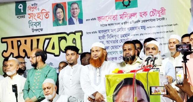 নিজস্ব প্রতিনিধি\ বিএনপি চেয়ারপারসনের উপদেষ্টা ও কুমিল্লা-৬ নির্বাচনী আসনের বিএনপি মনোনীত প্রার্থী মনিরুল হক চৌধুরী বলেছেন, তারেক রহমানের হাতে দেশ কখনো পথ হারাবে না। গত শুক্রবার (৭ই নভেম্বর) সন্ধ্যায় কুমিল্লা সদর দক্ষিণ উপজেলার শুয়াগাজী বাজারে জাতীয় বিপ্লব ও সংহতি দিবসের আলোচনা সভায় তিনি এ কথা বলেন। চৌধুরী বলেন, ৭ই নভেম্বর বাংলাদেশের জাতীয় জীবনের এক ঐতিহাসিক ও অবিস্মরণীয় দিন। এই দিনটি ‘জাতীয় বিপ্লব ও সংহতি দিবস’ হিসেবে পরিচিত। সেদিন সিপাহি ও জনতা এক হয়ে জিয়াউর রহমানকে মুক্ত করে দেশের নেতৃত্বে আনেন। এই ঐক্যের মধ্য দিয়েই শুরু হয় নতুন বাংলাদেশ গড়ার যাত্রা। জিয়াউর রহমান দেশকে রাজনৈতিক স্থিতিশীলতা দেন, জাতীয়তাবাদের ভিত্তি স্থাপন করেন এবং বহুদলীয় গণতন্ত্র চালু করেন।