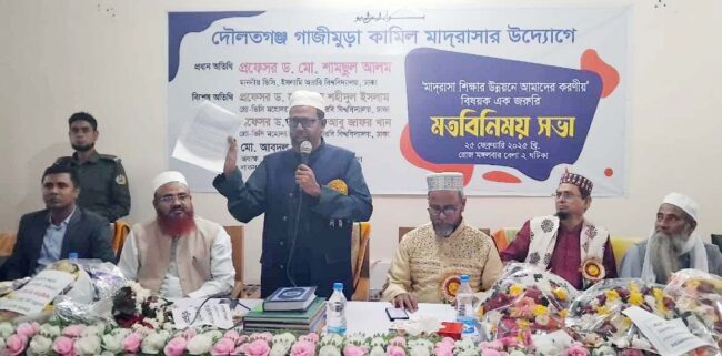 ষ্টাফ রিপোর্টার\ লাকসাম দৌলতগঞ্জ গাজীমুড়া কামিল মাদরাসার উদ্যোগে ‘মাদরাসা শিক্ষার মান উন্নয়নে আমাদের করনীয়’ বিষয়ে এক মতবিনিময় সভা গত মঙ্গলবার (২৫শে ফেব্রæয়ারি) মাদরাসার হল রুমে অনুষ্ঠিত হয়। মাদরাসা অধ্যক্ষ মাওলানা মোঃ আবদুল হান্নানের সভাপতিত্বে প্রধান অতিথি হিসেবে বক্তব্য রাখেন, ইসলামি আরবি বিশ্ববিদ্যালয়ের ভিসি প্রফেসর ড. মোঃ শামছুল আলম।