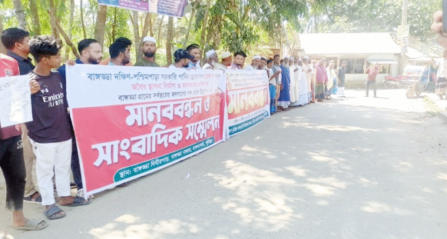 মানববন্ধনে বক্তারা বলেন, উপজেলার বাঙ্গড্ডা দক্ষিণ পাড়া গ্রামের হারুনুর রশিদ ও তার ছেলে মাস্টার শাহিন আলম বাঙ্গড্ডা দক্ষিণ পাড়াসহ পাশ্ববর্তী রায়কোট উত্তর ইউপির চারজানিয়া ও পেড়িয়া ইউনিয়নের চেহরিয়া ও দৌলতপুরসহ ৫ থেকে ৬টি গ্রামের ৫০ বছরের পুরনো পানি নিষ্কাশনের ড্রেন বন্ধ করে পাকা ভবন নির্মাণ করেন। এতে গত বর্ষায় কয়েকটি গ্রামের বাড়িঘর ও ফসলিজমি পানিতে তলিয়ে যায়। আগামী বর্ষা মৌসুমে এর ভয়াবহতা আরো বেড়ে গিয়ে মানুষের বাড়িঘর ও ফসলিজমিসহ সম্পদের ব্যাপক ক্ষতি হওয়ার সম্ভাবনা রয়েছে।