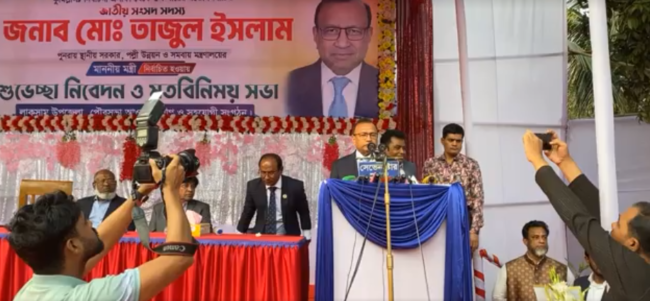 লাকসাম উপজেলা আওয়ামী লীগ অফিসের সামনে কুমিল্লা-৯ নির্বাচনী এলাকা থেকে ৫ম বারের মতো নির্বাচিত জাতীয় সংসদ সদস্য এবং পুনরায় স্থানীয় সরকার, পল্লী উন্নয়ন ও সমবায় মন্ত্রণালয়ের দায়িত্বপ্রাপ্ত মন্ত্রী নির্বাচিত হওয়ায় শুভেচ্ছা নিবেদন ও মতবিনিময় সভায় বক্তব্য রাখেন মো: তাজুল ইসলাম