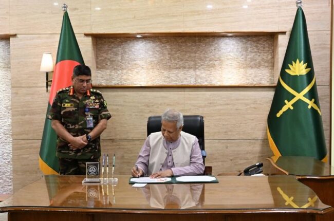 ড. ইউনূস বলেন, দেশের স্বাধীনতা ও সার্বভৌমত্ব রক্ষার পাশাপাশি অভ্যন্তরীণ স্থিতিশীলতা, শান্তি-শৃঙ্খলা বজায় রাখা এবং দুর্যোগকালীন বেসামরিক প্রশাসনকে সহায়তায় বাংলাদেশ সেনাবাহিনী গুরুত্বপূর্ণ ভূমিকা পালন করে আসছে। এ দায়িত্ব পালনে সেনাবাহিনীর ত্যাগ ও নিষ্ঠার জন্য তিনি সেনাপ্রধানসহ সকল সদস্যকে আন্তরিক ধন্যবাদ জানান।