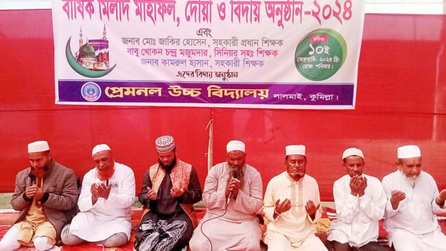 নিজস্ব প্রতিনিধি\ লালমাই উপজেলার প্রেমনল উচ্চ বিদ্যালয়ে এসএসসি পরীক্ষার্থীদের বিদায় উপলক্ষে বার্ষিক মিলাদ ও দোয়া গত শনিবার অনুষ্ঠিত হয়েছে। বিদায় অনুষ্ঠানে উপস্থিত ছিলেন, প্রতিষ্ঠানের প্রধান শিক্ষক আলহাজ মোহাম্মদ আলী, সহকারী প্রধান শিক্ষক জাকির হোসেন, সিনিয়র শিক্ষক বাবু খোকন চন্দ্র মজুমদার, সহকারি শিক্ষক কামরুল হাসান। অন্যান্যের মধ্যে আরো