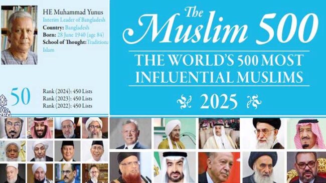 সম্প্রতি ২০২৫ সালের বিশ্বের সবচেয়ে প্রভাবশালী ৫০০ মুসলিম ব্যক্তিত্বের তালিকা প্রকাশ করেছে আম্মানের দ্য রয়েল ইসলামিক স্ট্র্যাটেজিক স্টাডিজ সেন্টার। সেই তালিকায় ৫০ নম্বরে রাখা হয়েছে ড. ইউনূসকে।