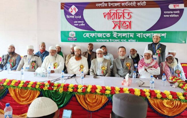 নিজস্ব প্রতিনিধি॥ হেফাজতে ইসলাম বাংলাদেশ কুমিল্লার মনোহরগঞ্জ উপজেলা নবগঠিত কমিটির পরিরিচিতি সভা অনুষ্ঠিত হয়। গতকাল মঙ্গলবার বিকাল ৪টায় মনোহরগঞ্জ সরকারি উচ্চ বিদ্যালয় ও কলেজ মিলনায়তনে এ সভা অনুষ্ঠিত হয়েছে। সভায় উপজেলা হেফাজতে ইসলাম বাংলাদেশ এর নবগঠিত কমিটির সভাপতি মাও. শহিদুল্লাহ এর সভাপতিত্বে প্রধান অতিথির বক্তব্য রাখেন, হেফাজতে ইসলাম বাংলাদেশ লাকসাম অঞ্চলের উপদেষ্টা নাসির ফাউন্ডেশন এর চেয়ারম্যান আলহাজ্ব নাসির উদ্দিন মজুমদার। প্রধান বক্তার বক্তব্য রাখেন, হেফাজতে ইসলামের কেন্দ্রীয় সাংগঠনিক সম্পাদক মুফতি শামছুল ইসলাম জিলানি। বিশেষ অতিথির বক্তব্য রাখেন, মনোহরগঞ্জ উপজেলা পরিষদের সাবেক চেয়ারম্যান মোঃ ইলিয়াছ পাটওয়ারী, উপজেলা জামায়াতে ইসলামির আমির হাফেজ মোহাম্মদ নুরুন্নবী, উপজেলা বিএনপির সাবেক আহবায়ক আবু ইউসুফ ভূঁইয়া, উপজেলা যুবদলের আহ্বায়ক রহমাত উল্লাহ জিকু, মনোহরগঞ্জ বাজার ব্যবসায়ী সমিতির সাধারণ সম্পাদক আব্দুল হাই বাবুল।
