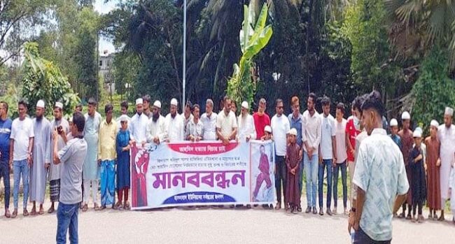 নিজস্ব প্রতিনিধি\ কুমিল্লার মনোহরগঞ্জে এতিমখানার শিশু শিক্ষার্থী তাহমিদ হত্যার বিচার ও হত্যাকারীদের গ্রেপ্তারের দাবিতে মানববন্ধন করেছে এলাকাবাসী। গত সোমবার (১৮ই আগস্ট) সকাল ১১টায় উপজেলার হাসনাবাদে এই মানববন্ধন অনুষ্ঠিত হয়। মানববন্ধনে বক্তব্য রাখেন, হাসনাবাদ ইউনিয়নের সাবেক চেয়ারম্যান আবদুল মান্নান, আবদুল মুনাফ, কুমিল্লা দক্ষিণ জেলা যুবদলের সদস্য সচিব ফরিদ উদ্দিন শিবলু, মাদরাসার মুহতামিম আবু ইউসুফ, তাহমিদের মামা মোঃ মামুন, বিশিষ্ট সমাজ সেবক আবদুল মজিদ ভূঁইয়া, বেলাল হোসেন বেলাল, সাবমির মাহমুদ শামীম প্রমুখ। বক্তারা বলেন, তাহমিদ হত্যাকান্ডের ৪ মাস অতিবাহিত হলেও পুলিশ এখনো খুনিদের চিহ্নিত করতে পারেনি। এটা অত্যন্ত দুঃখজনক ঘটনা। এছাড়া, ময়নাতদন্ত রিপোর্টে তাহমিদকে হত্যা করা হয়েছে রিপোর্ট আসার ২০ দিন পরও খুনিদের চিহ্নিত করতে পুলিশের কোনো তৎপরতা দেখা যাচ্ছেনা। তাই তাহমিদের প্রকৃত খুনিদের খুঁজে বের করে সর্বোচ্চ শাস্তির দাবি জানান স্থানীয় জনতা।