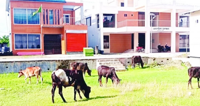 মনোহরগঞ্জ উপজেলা পরিষদ মাঠে অবাধে বিচরণ গরু-ছাগলের