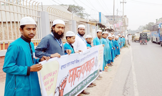 জামায়াত নেতা ইকবাল হোসেন ও নাজমুল হাসানের যৌথ সঞ্চালনায় মানববন্ধন কর্মসূচিতে আরো বক্তব্য রাখেন, তালুকদার স্কুলের প্রতিষ্ঠাতা আবদুল ওয়াদুধ তালুকদার, বাগমারা উচ্চ বিদ্যালয়ের প্রধান শিক্ষক মনির আহমেদ, সহকারী শিক্ষক আবদুল করিম প্রমুখ।