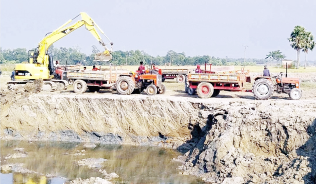 নিজস্ব প্রতিনিধি\ কুমিল্লার মুরাদনগরে ৩ ফসলি কৃষি জমির বুক চিরে ছুটছে ট্রাক্টরের পর ট্রাক্টর। লক্ষ্য ফসলি জমি থেকে কাটা মাটি ইটভাটায় নিয়ে আসা। সামান্য অদূরেই চলছে বিস্তীর্ণ ফসলি জমির মাঝ খান থেকে অত্যাধুনিক ভেকু মেশিন দিয়ে জমির মাটি কাটার কর্মযজ্ঞ। সে মাটি সংগ্রহে ব্যস্ত অসংখ্য ট্রাক্টরের শ্রমিক। যে জমির উপরিভাগে ধান বোনা হতো, সে জমিতে এখন বিশাল আকারের গর্ত। এভাবেই মুরাদনগর উপজেলার বিপুল পরিমান ৩ ফসলি জমির মাটি যাচ্ছে ইটভাটার পেটে। এতে করে ওই জমিগুলো যেমন উর্বরতা হারাচ্ছে, তেমনি ধ্বংস হচ্ছে এসব ফসলি জমি।