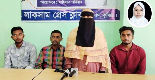 নিজস্ব প্রতিনিধি\ কুমিল্লার লাকসামে ইক্বরা মহিলা মাদরাসার ছাত্রী সামিয়া হত্যাকান্ডে সন্দেহভাজন মাদরাসা সুপার জামাল উদ্দিনসহ ৩ জনকে গ্রেফতারের দাবি জানানো হয়েছে। গত সোমবার (২৮শে এপ্রিল) দুপুরে লাকসাম প্রেস ক্লাবে পরিবারের পক্ষ থেকে এক সংবাদ সম্মেলনে এ দাবি জানান সামিয়ার মা শারমিন বেগম। আগেরদিন রোববার (২৭শে এপ্রিল) রাতে সামিয়াকে হত্যার অভিযোগ এনে তিনি লাকসাম থানায় একটি এজাহার দিয়েছেন। এজাহারের বিষয়টি নিশ্চিত করেছেন থানার অফিসার ইনচার্জ (ওসি) নাজনীন সুলতানা।