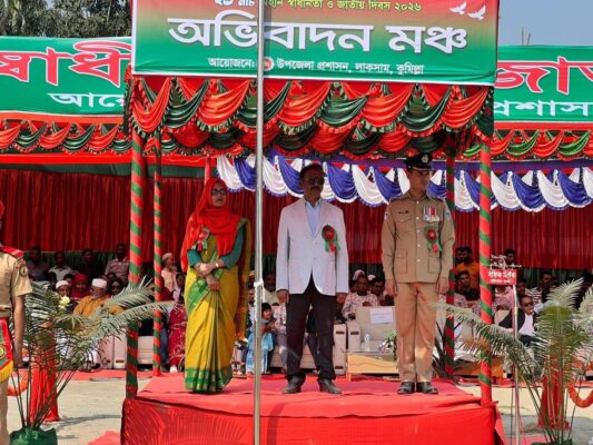 ষ্টাফ রিপোর্টারঃ কুমিল্লার লাকসামে যথাযোগ্য মর্যাদায় মহান স্বাধীনতা ও জাতীয় দিবস ২০২৬ উপজেলা প্রশাসনের আয়োজনে উপজেলা পরিষদ মাঠ প্রাঙ্গণে গতকাল বৃহস্পতিবার (২৬ মার্চ) উদযাপিত হয়েছে। লাকসাম উপজেলা নির্বাহী অফিসার নার্গিস সুলতানার সভাপতিত্বে অনুষ্ঠানে প্রধান অতিথি হিসেবে উপস্থিত ছিলেন, কুমিল্লা-৯ (লাকসাম-মনোহরগঞ্জ) আসনের সংসদ সদস্য মো. আবুল কালাম। বিশেষ অতিথি হিসেবে উপস্থিত ছিলেন, লাকসাম থানার অফিসার ইনচার্জ (ওসি) মাকসুদ আহম্মেদ, সহকারী কমিশনার (ভূমি) মিলন চাকমা, উপজেলা নির্বাহী প্রকৌশলী মো. সাদিকুল জাহান রিদান, কৃষি কর্মকর্তা আল-আমিন, উপজেলা পরিষদের কর্মকর্তা-কর্মচারী, সাংবাদিক, সামাজিক সংগঠন, মুক্তিযোদ্ধা, শিক্ষাপ্রতিষ্ঠান, এনজিওসহ বিভিন্ন পেশাজিবী সংগঠনের নেতৃবৃন্দ। অনুষ্ঠানে প্রধান অতিথি কুছকাওয়াজ প্রতিযোগিতায় বিজয়ীদের মাঝে পুরস্কার বিতরণ করেন।
