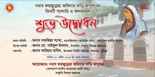 ষ্টাফ রিপোর্টার॥ কুমিল্লা জেলার লাকসামে নবাব ফয়জুন্নেছা জমিদার বাড়ি জাদুঘরের তিনটি গ্যালারি ও অন্দর মহল উদ্বোধন করা হয়েছে। গতকাল শুক্রবার (১৮ই এপ্রিল) বিকেলে লাকসাম উপজেলা নির্বাহী কর্মকর্তা কাউছার হামিদের সভাপতিত্বে এ উপলক্ষে আয়োজিত উদ্বোধনী অনুষ্ঠানে অতিথি ছিলেন, সংস্কৃতি বিষয়ক মন্ত্রণালয়ের উপসচিব মো. সাইফুল ইসলাম, জাতীয় জাদুঘরের সচিব সাদেকুল ইসলাম।