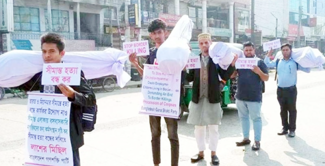 নিজস্ব প্রতিনিধি\ কাঁধে প্রতীকী লাশ, হাতে প্ল্যাকার্ড নিয়ে বাংলাদেশের সীমান্তবর্তী ৩২টি জেলার ৭২টি উপজেলায় সীমান্তে হত্যা বন্ধের দাবিতে মিছিল কর্মসূচি শুরু করেছেন নোয়াখালীর সুধারাম উপজেলার নিয়াজপুর ইউনিয়নের জাহানাবাদ গ্রামের আবদুল মান্নানের ছেলে হানিফ বাংলাদেশী। গত শুক্রবার সকাল ১০টায় কক্সবাজারের টেকনাফ পৌরসভার অলিয়াবাদ জিরো পয়েন্ট থেকে এ কর্মসূচি শুরু হয়েছে।