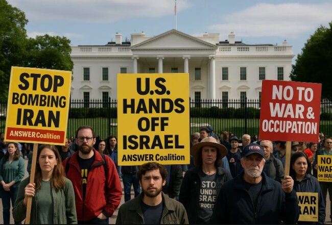 হোয়াইট হাউসের সামনে যুদ্ধবিরোধী স্লোগানে মুখর একদল বিক্ষোভকারী জড়ো হয়েছেন। তাঁদের প্রধান দাবি, ইসরায়েল ও ইরানের চলমান সংঘাতে যুক্তরাষ্ট্র যেন আর কোনোভাবে সম্পৃক্ত না হয়।