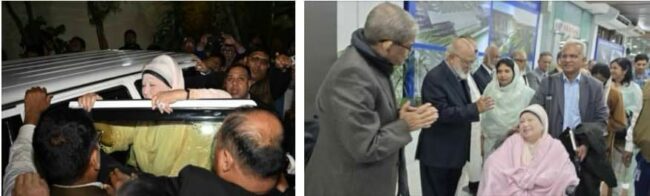 এর আগে রাত সোয়া ৮টায় গুলশানের বাসভবন ফিরোজা থেকে একটি গাড়িতে খালেদা জিয়া বিমানবন্দরের উদ্দেশে রওনা দেন। রাত ১০টা ৫৫ মিনিটে বিমানবন্দরের ৮ নম্বর গেট (হ্যাঙ্গার গেট) দিয়ে তিনি প্রবেশ করেন। গাড়িতে তার পাশে ছিলেন ছোট ছেলে প্রয়াত আরাফাত রহমান কোকোর স্ত্রী সৈয়দা শামিলা রহমান (সিঁথি)। সাবেক প্রধানমন্ত্রী খালেদা জিয়া বিমানবন্দরের উদ্দেশে রওনা হওয়ার পর সেখানে বিএনপির মহাসচিব মির্জা ফখরুল ইসলাম আলমগীর সাংবাদিকদের বলেন, ‘ম্যাডাম বাসা থেকে রওনা হয়েছেন। তিনি আপনাদের মাধ্যমে দেশবাসীসহ সবার কাছে দোয়া চেয়েছেন।’ ওদিকে, খালেদা জিয়াকে বিদায় জানাতে তার বাসভবন থেকে বিমানবন্দর পর্যন্ত রাস্তায় বিএনপির নেতা–কর্মীদের ঢল নেমেছে। হাজারো নেতা–কর্মী রাস্তার দুই পাশে দাঁড়িয়ে বিভিন্ন স্লোগান দিয়ে তাকে বিদায় জানাতে থাকেন। উল্লেখ্য, দীর্ঘদিন ধরে নানা অসুস্থতায় ভুগছেন খালেদা জিয়া। কাতারের আমিরের পাঠানো বিশেষ এয়ার অ্যাম্বুলেন্সে করে চিকিৎসার জন্য সেখানে যাচ্ছেন। খালেদা জিয়ার সঙ্গে যাচ্ছেন মেডিকেল টিমের ছয় চিকিৎসকও।